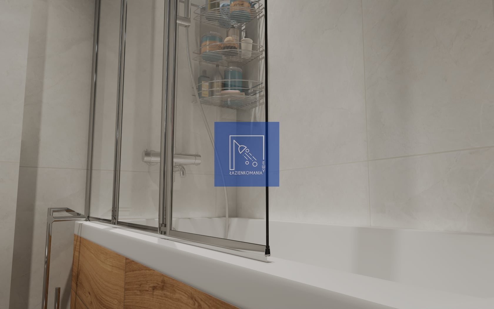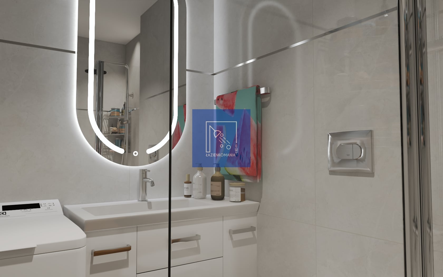 Mini przestrzeń z maksi sprzętem. Jest pralka i umywalka, jest toaleta, wanna z prysznicem i parawanem. I piękne podświetlone lustro. Asymetryczna umywalka z szafką, w której zmieści się wszystko, co potrzeba (chociażby proszek do prania). W strefie wanny z prysznicem miejsce na kosmetyki, bo któż nie ma żeli, szamponu czy płynu do mycia twarzy ?