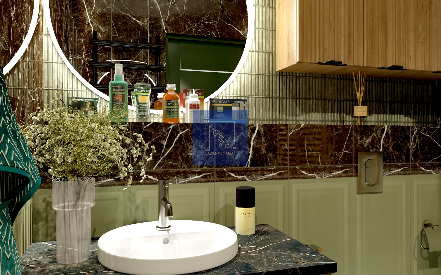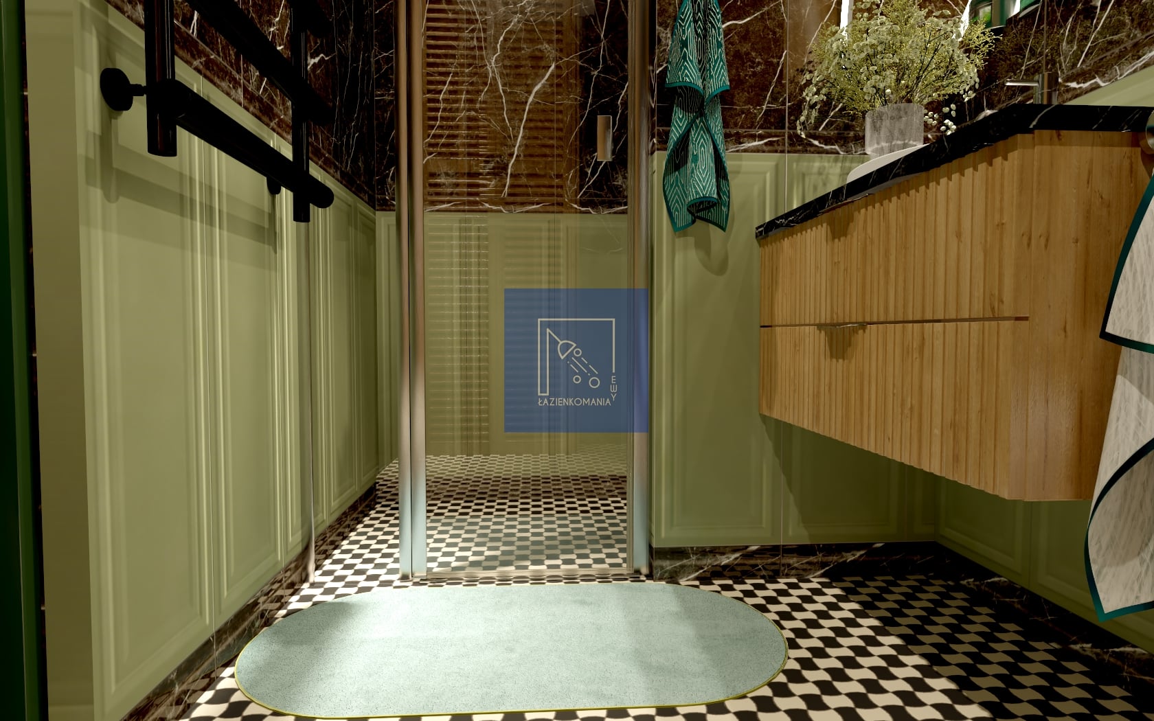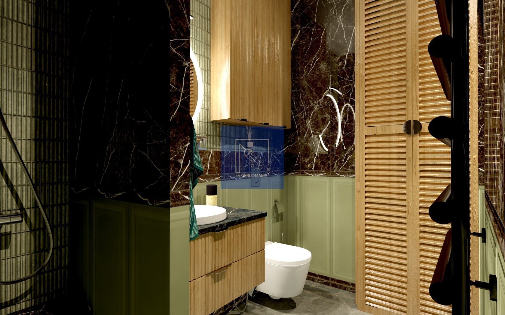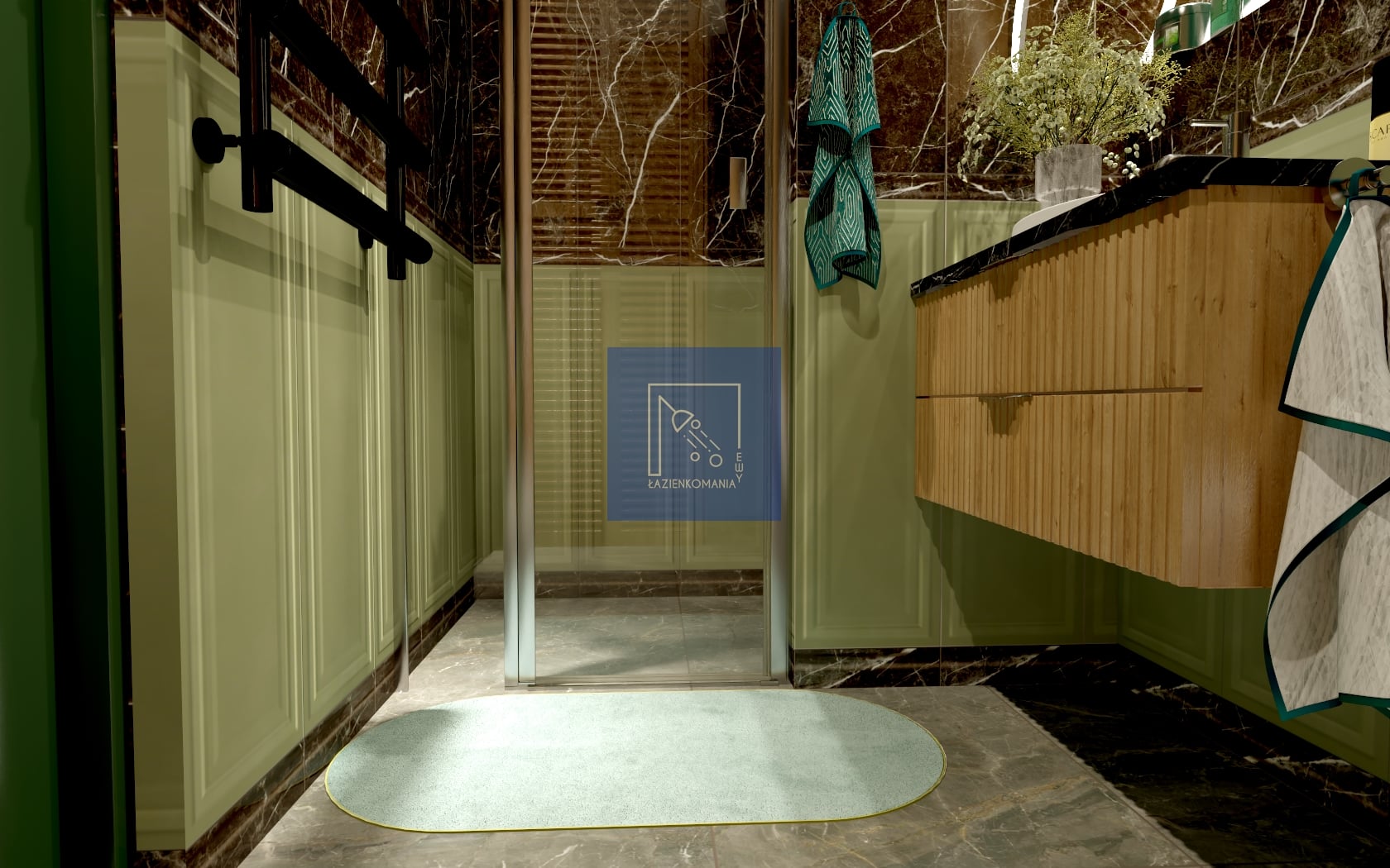 Poniosła mnie fantazja, więc łazienka wyszła w klimacie z angielską boazerią w odcieniu zieleni. Jako że lubię połączenia z innymi nieoczywistymi strukturami, poszłam w klimat ciemnego kamienia z żyłką. Baterie w odcieniu niklu, nie zabrakło też drewna, które jest obecne na zabudowie meblowej. Na płytkę podłogową mam dwie opcje, z której jedną jest płytka w formie mozaiki.