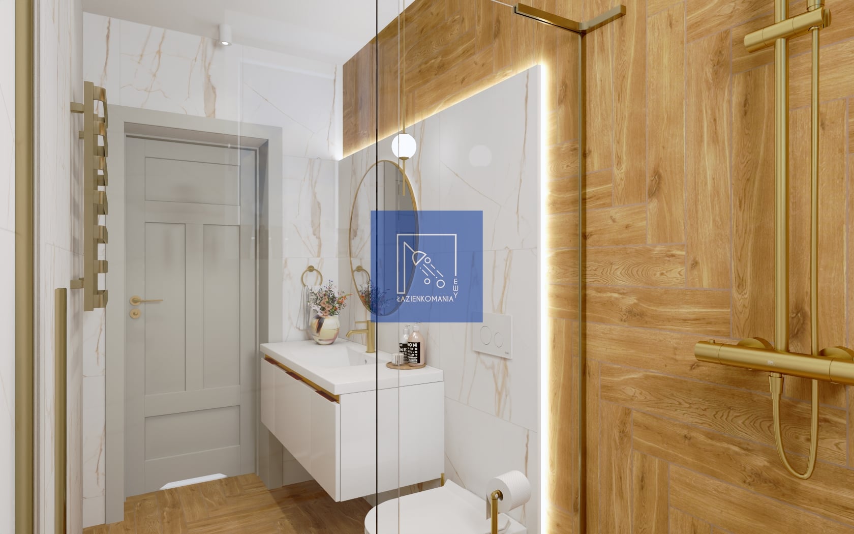 W łazience tej przeważa motyw jodełki bardzo popularnej płytki o wymiarze 60x11. Dylematem był format płytki użytej na ścianie, z uwagi na niekorzystne docinki płytki 60x120, wybrałam format mniejszy - 60x60. Modne dodatki, modna już kolorystyka baterii i wyszło przytulnie i stylowo.