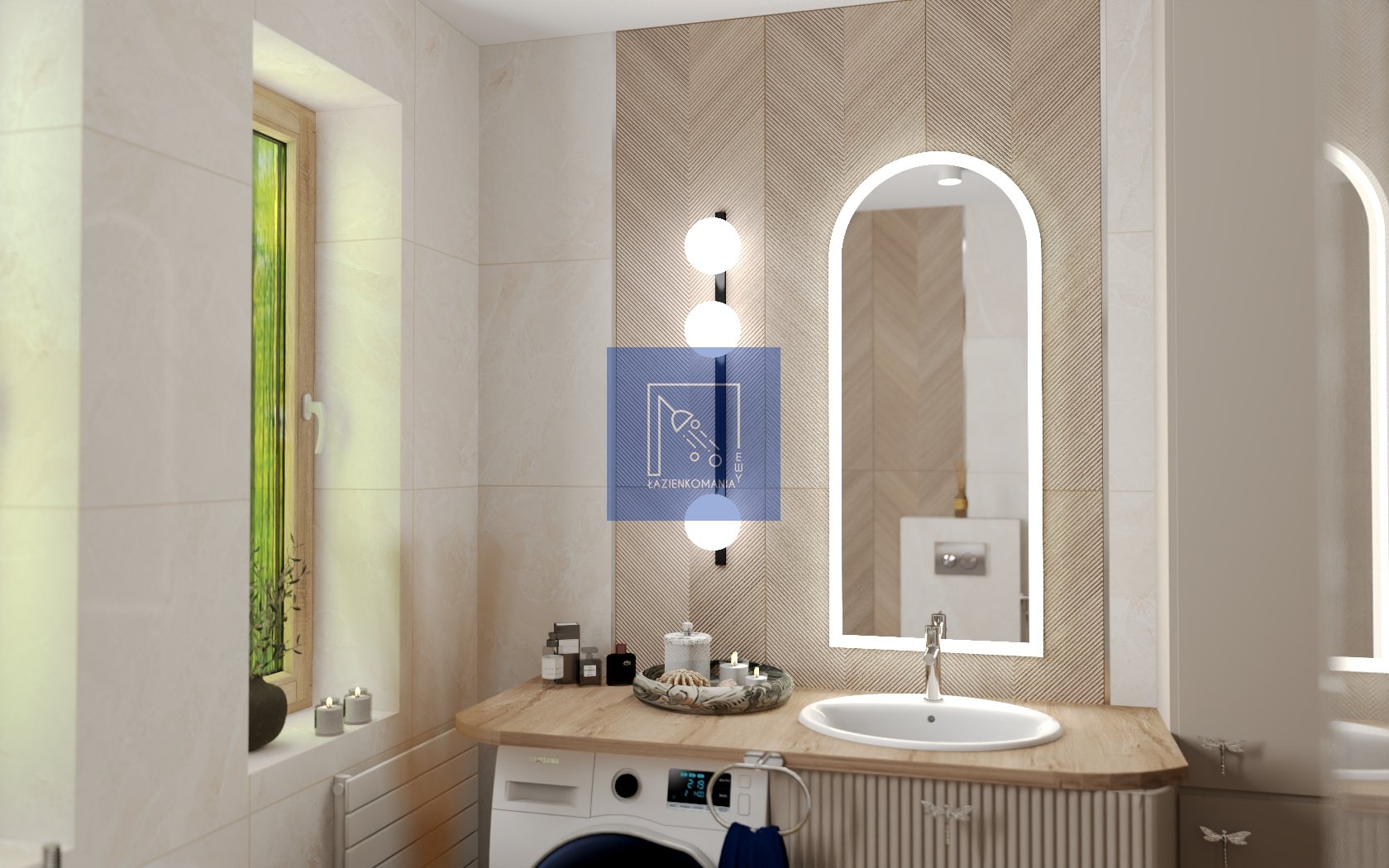 Bardzo często pojawiający się motyw jodełki w połączeniu z płytką w ciepłej kolorystyce. Zachwyciłam się dzisiaj uchwytami meblowymi w kształcie ważki. Niewielki ozdobny element, a zmienił wygląd mebli. Całość w spokojnych stonowanych barwach, dzięki czemu łazienka ta będzie ponadczasowa. Ciepłe, harmonijne wnętrza nigdy się nie znudzą. Kolorystyka baterii może być dowolna, będą pasowały zarówno złote, jak i w kolorze bieli, a nawet miedzi.